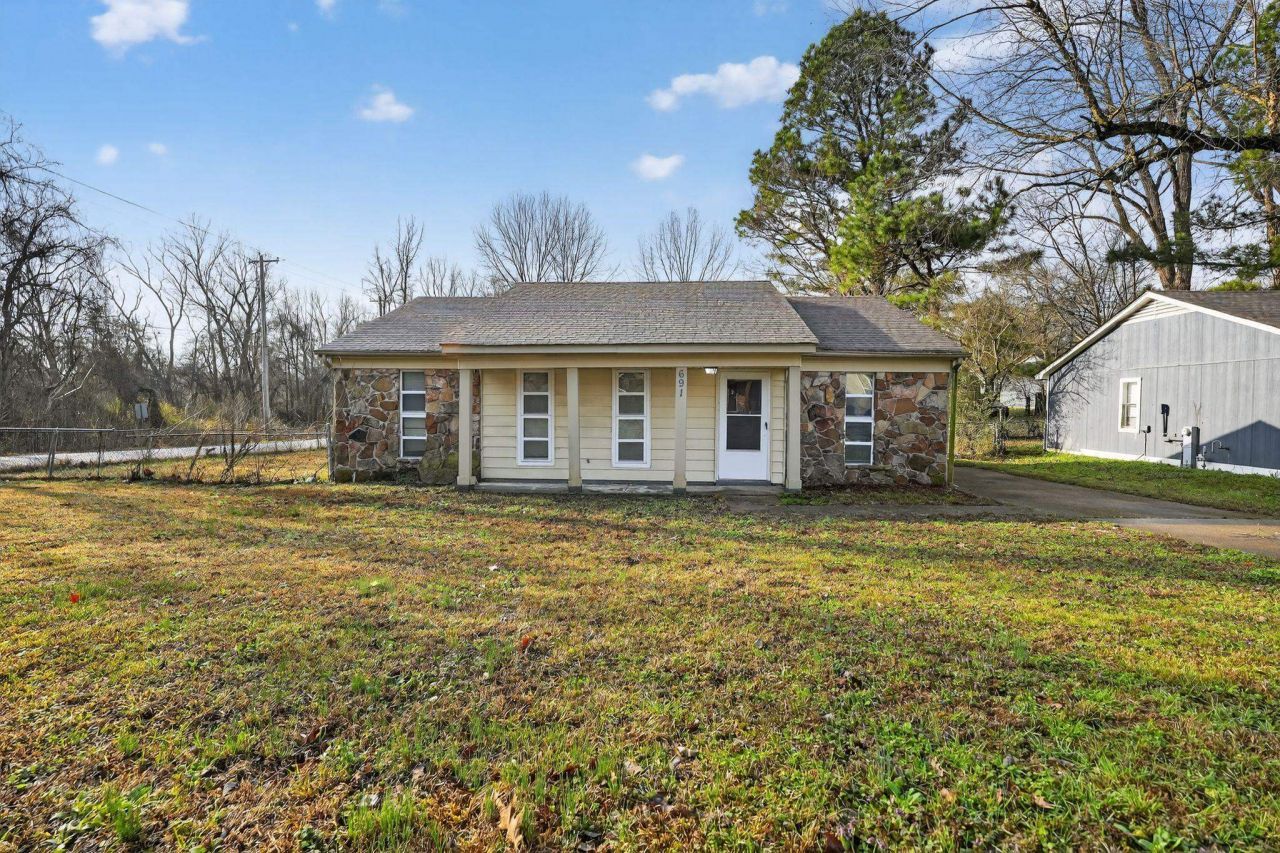 1,085 sq ft ranch-style home, perfectly situated on a 0.195-acre lot in the heart of Memphis. Built in 1979, this 4-bedroom, 2-bathroom residence offers an ideal blend of classic charm and modern updates, featuring a durable vinyl siding exterior accented by large, decorative stone siding. Step onto the inviting covered front porch before entering a home that boasts gorgeous hardwoods throughout the main living areas and plush carpeting in all four bedrooms. The updated kitchen is a chef's delight with sleek solid surface countertops and ample cabinetry, while the functional layout includes a dedicated laundry area with washer and dryer hookups conveniently located in a walk-in closet off the main hallway. The primary suite serves as a private retreat, featuring its own door for direct access to the expansive backyard. Outdoor living is a breeze in the fully chain-link fenced backyard, perfect for pets and play, which also houses a unique barn-shaped storage shed.